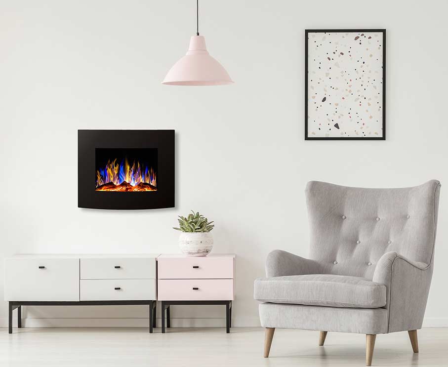Malibu je sodoben stenski električni kamin. Sprednja plošča je lepo zakrivljena in tako velik črn okvir okrog plamena poudarja njegovo lepoto.